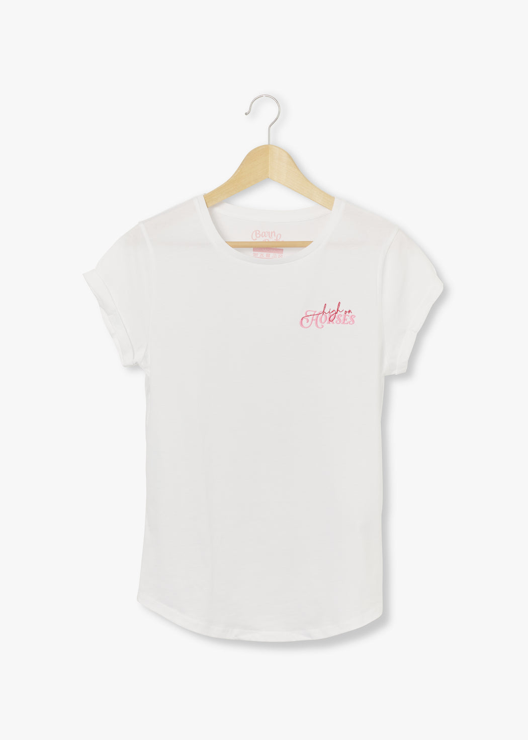 Jippie! Die Temperaturen klettern nach oben und es wird Zeit für frische und luftige Shirts, welche sich perfekt für die kommenden Frühlings- und Sommertage eignen! Unser neues veganes T-Shirt in weiß besteht aus 100% Baumwolle aus biologischem Anbau und ist mit seinem verspielten rosaroten Stick "High on Horses" ein echter Hingucker! Die Ärmel sind raffiniert aufgerollt und schmeicheln Deinen von der Sonne geküssten Armen.