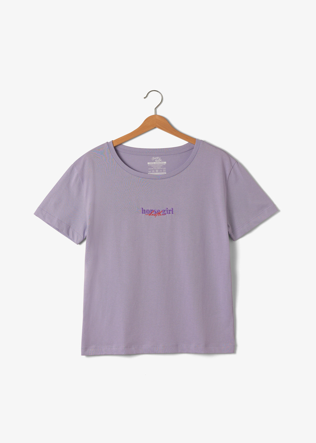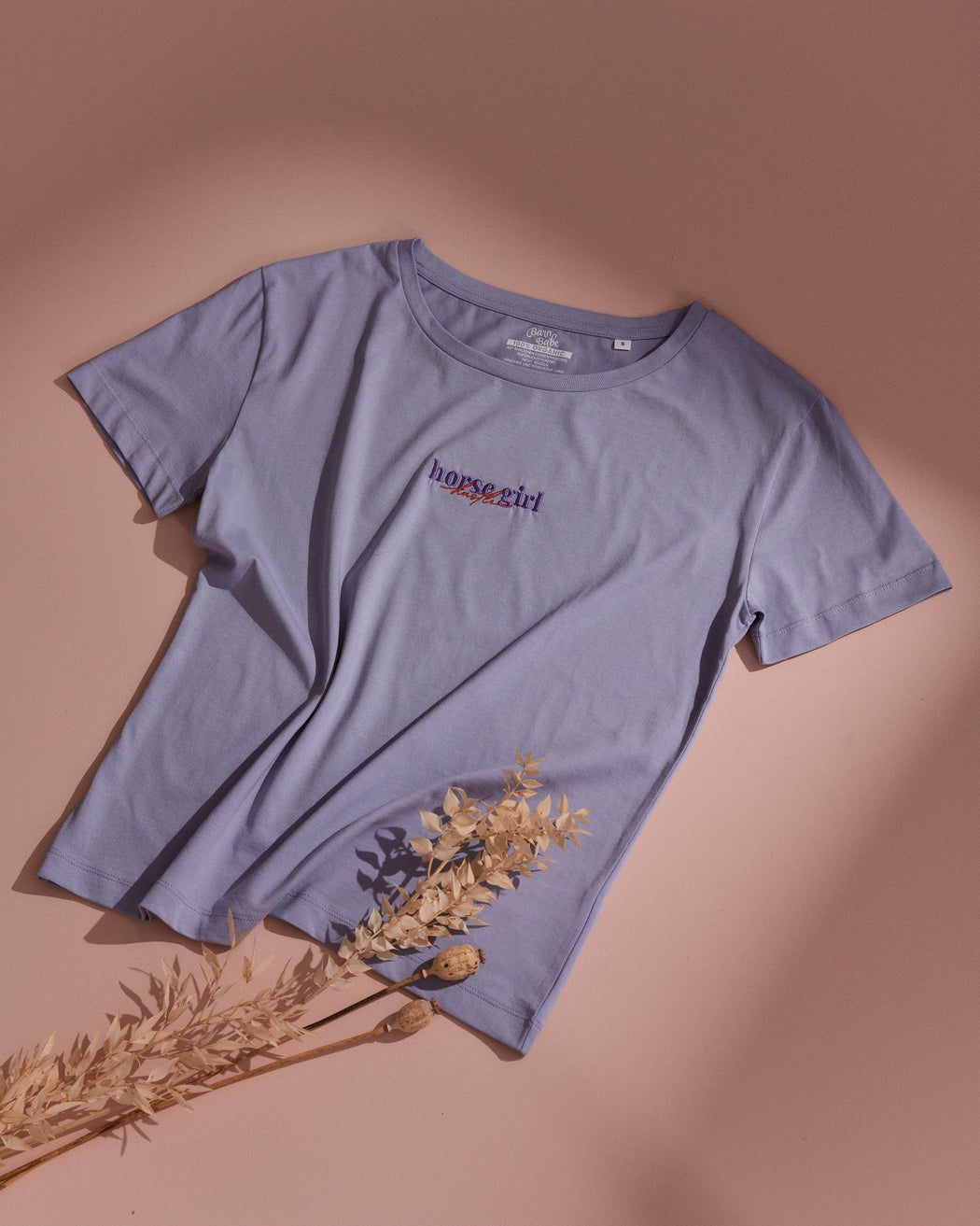Jippie! Auch im goldenen Herbst freuen wir uns über ein luftiges Shirt, es eignet sich perfekt zum tragen unter unserem tollen Jeansblouson oder eine unserer Sweatjacken! Unser neues veganes T-Shirt in Flieder besteht aus 100% Baumwolle und ist mit seiner lila und roten "horse girl hustle" Stickerei ein echter Hingucker!