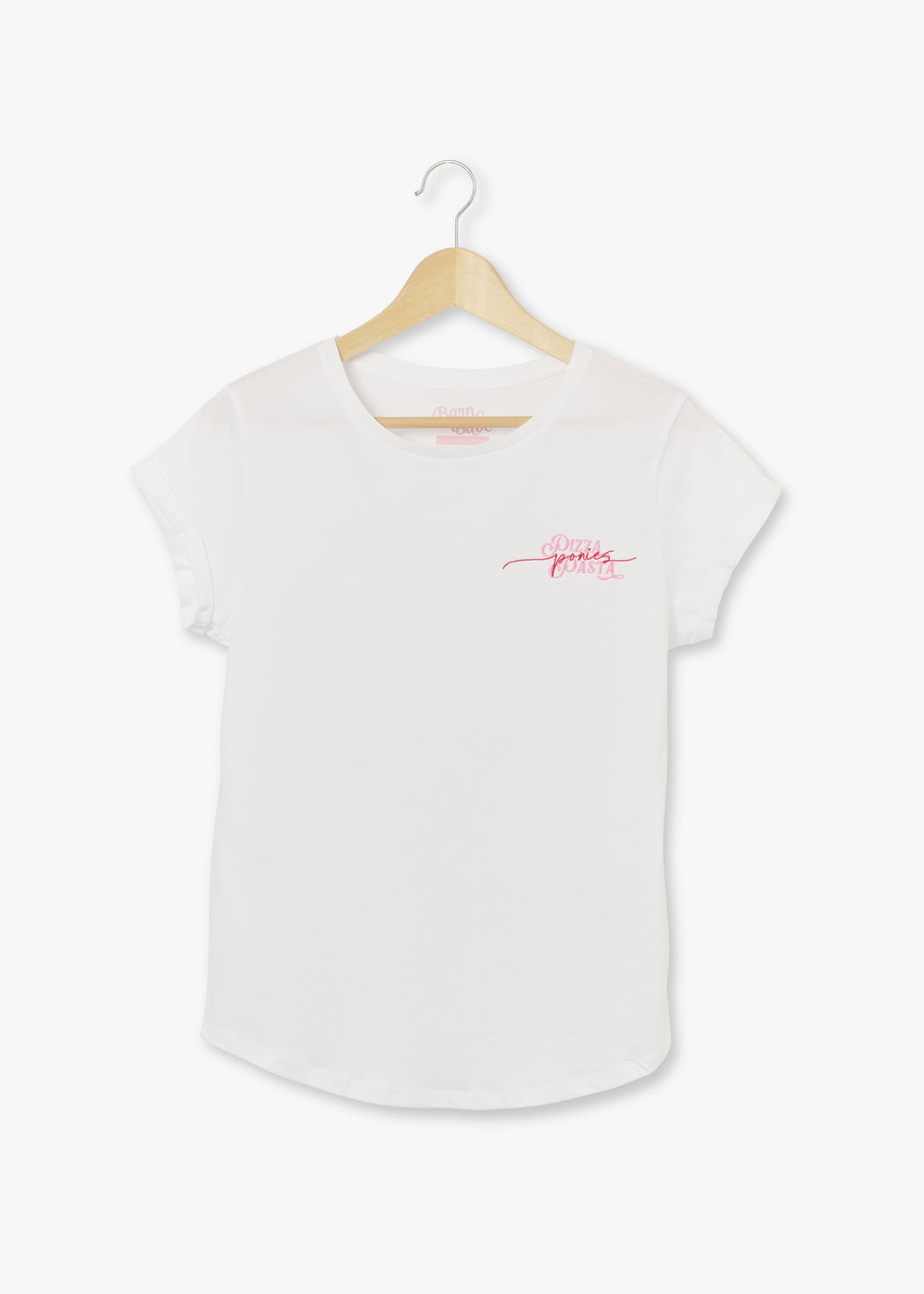 Jippie! Die Temperaturen klettern nach oben und es wird Zeit für frische und luftige Shirts, welche sich perfekt für die kommenden Frühlings- und Sommertage eignen! Unser neues veganes T-Shirt in weiß besteht aus 100% Baumwolle aus biologischem Anbau und ist mit seinem verspielten rosaroten Stick "Pizza, Pasta, Ponies" ein echter Hingucker! Schließlich gibt es doch nichts Schöneres, als mit Pferdefreund*innen auch eine kulanirsche Welt zu teilen. Die Ärmel sind raffiniert aufgerollt und schmeicheln Deinen von der Sonne geküssten Armen.