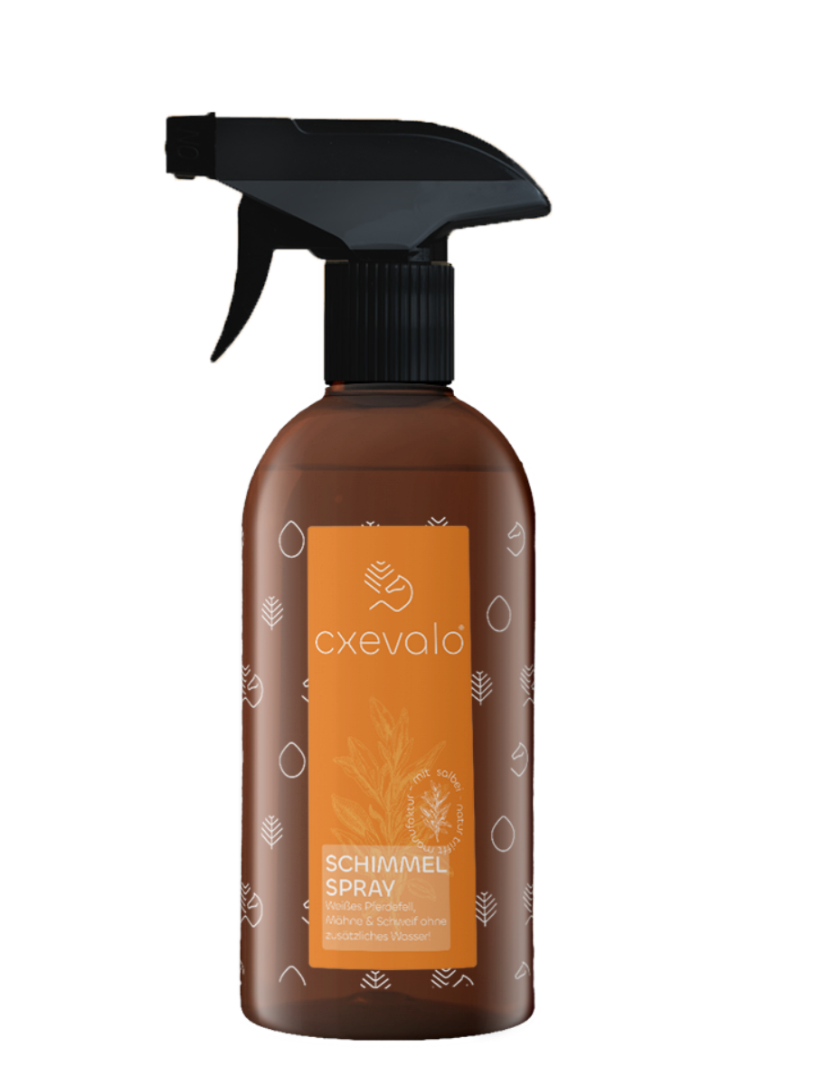 Das CXEVALO Schimmelspray wirkt wie ein Trockenshampoo für Pferde und reinigt, auf Basis pflanzlicher Inhaltsstoffe weißes Fell, Mähne- und Schweif sanft und ohne zusätzliches Wasser. Das Produkt entfernt Gras- und Schmutzflecken und sorgt, dank einzigartigem Kristallblau, für den perfekt strahlend, weißen Look. Das Kristallblau reflektiert das Sonnenlicht von Fell und Langhaar besonders Weiß zurück und macht gelbliche Verfärbungen unsichtbar. Deshalb können wir selbstverständlich auf chemische Bleichmittel verzichten ohne auf ein strahlendes Ergebnis verzichten zu müssen. Die enthaltenen Weizenproteine glätten die Haarstruktur und sorgen so dafür, dass neue Flecken und Verfärbungen nicht so schnell entstehen.