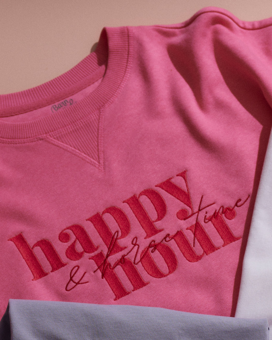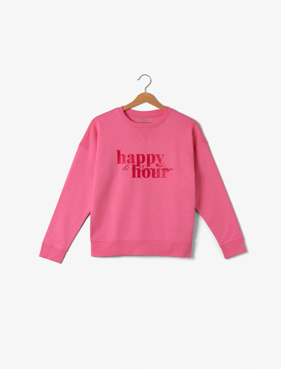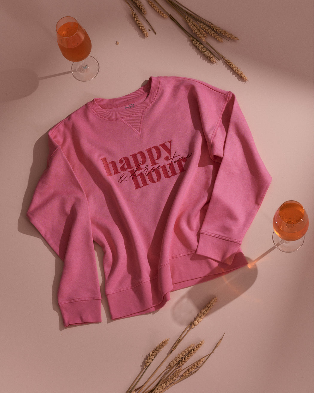 Ob Stalltag oder Alltag – dieses Sweatshirt mit einer überschnittenen Schulterpartie wirkt durch den tollen "Happy Hour & Horse Time" Stick edel und elegant.